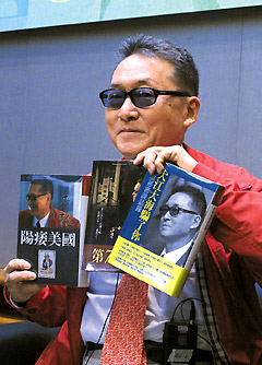 李敖到香港書展演講,展示三本近期作品。圖片來源:臺灣《聯合報》