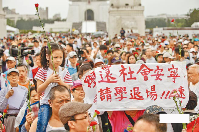 上千名的警眷家屬29日齊聚中正紀念堂,搖著手上的康乃馨,對于占領“立法院”的學生們發出溫情喊話,呼吁學生們趕快返家。(圖片來自臺媒)