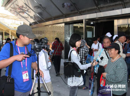 中國臺灣網(wǎng)記者在采訪參觀臺灣館的游客。(中國臺灣網(wǎng) 鐘寶華 攝)