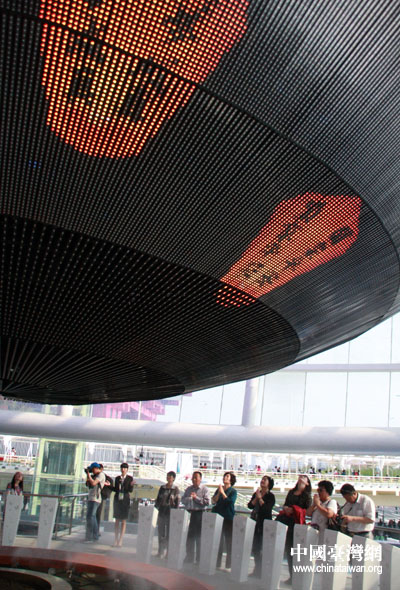 近觀臺灣館,巨大的天燈(即孔明燈)造型連接刻有如意花紋的不銹鋼山體墻面,100萬個LED燈組成的球幕透過玻璃燈罩為游客們展演臺灣豐富多元的藝術影像。炫目的光影效果吸引諸多游客在臺灣館前流連,而臺灣館的出色只有走進這盞“天燈”,才能真正的體會。
