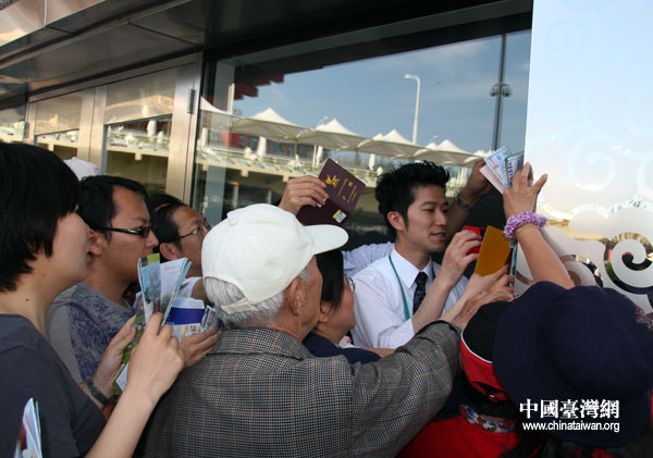 參觀完臺灣館的游客簇擁在出口處,讓工作人員在自己的“世博護照”上蓋上臺灣館的印章。(中國臺灣網 鐘寶華 攝)