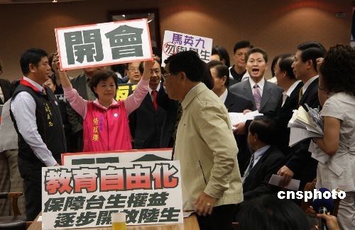 臺(tái)灣“立法院內(nèi)政委員會(huì)”4日排定審議攸關(guān)大陸學(xué)歷認(rèn)證、陸生來(lái)臺(tái)的“兩岸人民關(guān)系條例”修正草案,下午議程因民進(jìn)黨“立委”將委員會(huì)會(huì)議室大門(mén)反鎖,導(dǎo)致議事停擺。圖為民進(jìn)黨“立委”占據(jù)主席臺(tái)后,國(guó)民黨“立委”舉起要求正常開(kāi)會(huì)的標(biāo)語(yǔ)牌。(圖片來(lái)源:中新社)