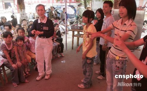 5月31日,四川什邡市洛水中學(xué)廢墟附近,來自臺灣佛教慈濟(jì)基金會(huì)的志工在與災(zāi)區(qū)學(xué)生一起排練節(jié)目,進(jìn)行心理疏導(dǎo)。 中新社發(fā) 張曉理 攝