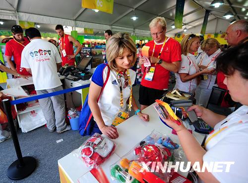 8月19日,顧客正在收銀臺結賬。 連日來,前往北京奧運村內的北京奧運會特許商品零售店購買紀念品的顧客增多,部分已經結束比賽的運動員臨別之前紛紛來到這里,為親朋選購具有中國特色的禮物。 新華社記者李紫恒攝