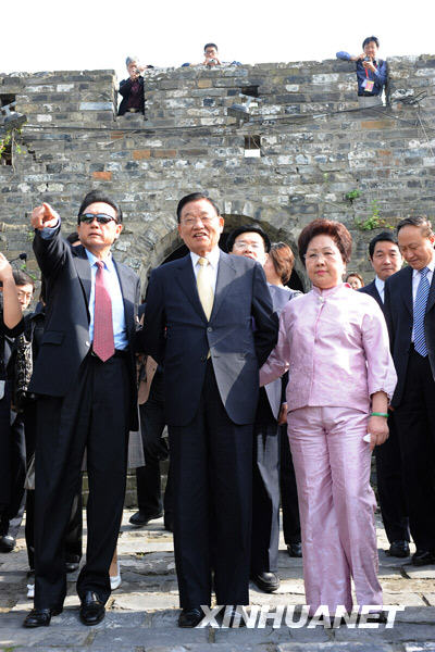 4月25日,臺(tái)灣海基會(huì)董事長(zhǎng)江丙坤和夫人在海協(xié)會(huì)會(huì)長(zhǎng)陳云林陪同下參觀(guān)南京明城墻。新華社記者韓瑜慶攝