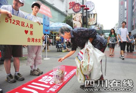 同樣的情景還在市中心上演,志愿者們舉著展板和募捐橫幅,不間斷地在春熙路上流動募捐。路過的市民,不時駐足看看橫幅和展板,“哦,是給臺灣募捐”,了解到募捐目的后,不少人從衣袋或錢包里摸出錢來,塞進 透明的募捐箱內。志愿者們對每一位捐贈者都致以敬意,“謝謝”聲不斷。來自成都某高等專科學校的志愿者文紅鈺說:“錢不在多,一元錢勝過萬句口號。”一位約60歲的太婆,將錢用紙包起來塞入募捐箱內。原來,那張紙里包著他們一家8口的“愛心”,知道這里有水災的募捐后,“昨晚,一家人商量著把自己要捐的錢都拿出來,我今天代表他們把錢送過來。”太婆說。“受災都不好過,能捐就捐點。”