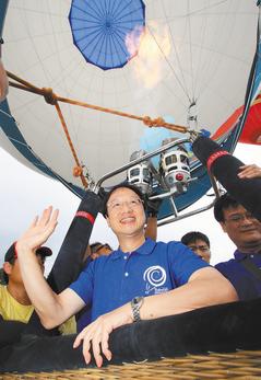 有馬英九力挺,“行政院長”江宜樺(中)昨天將“請辭”傳聞拋在腦后,展現(xiàn)自信體驗臺東熱氣球“高飛”的快感。圖片來源:臺灣《聯(lián)合報》