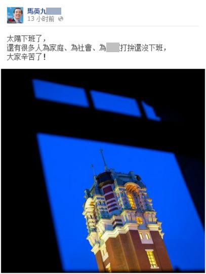 馬英九的臉書大多是PO出前一天重要場合的公開發言,或針對特定紀念日發文,少有短訊,但12日下班時間卻發文說:“太陽下班了,還有很多人為家庭、為社會、為臺灣打拚還沒下班,大家辛苦了!”,結果卻遭到島內網友痛罵,指責他不知民間疾苦。(圖片來源:馬英九個人臉書網頁)