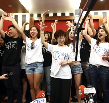 臺灣“立法院副院長”洪秀柱(中)11日到錄制室與青年朋友共同錄制競選歌曲《勇敢翻轉》,氣氛high到不行。(中時電子報圖 陳信翰攝)