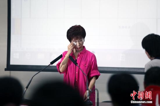 圖為洪秀柱在民調揭曉后與媒體及支持者見面時,以紙巾擦拭眼角。黃少華 攝