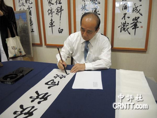9日上午,王金平利用空閑時間揮毫寫下“欣欣向榮”四個字,當做明年春聯題字。(圖自中評社)