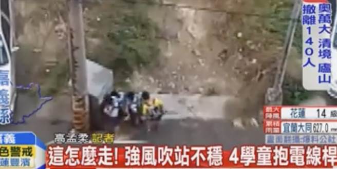 嘉義縣小學生不敵強風吹襲,只能躲在電線桿后方。(圖片取自臺灣中天新聞)