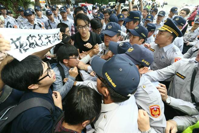 學生與勞工團體在蔡英文官邸外與警察發生推擠。(圖片來源:臺灣“中時電子報”)