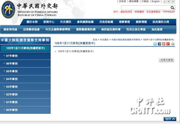據悉,陳水扁執政時期,臺外事部門即在官方網站上刊出“大陸阻撓我國際空間事例”。而馬英九上任后就再未公開過,相關網頁也一直空白至今。