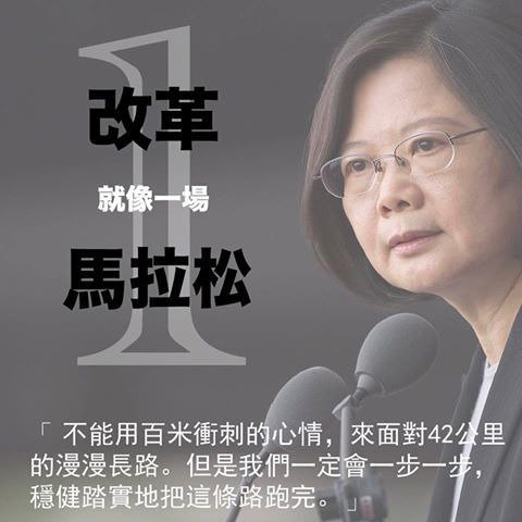 據報道,蔡英文昨天在臉書PO出一張結合自己照片與文字的后制圖,上面寫道:“改革就像一場馬拉松,不能用百米沖刺的心情,來面對42公里的漫漫長路。但是我們一定會一步一步,穩健踏實地把這條路跑完”,彷佛是在響應近來對臺當局改革的反彈聲浪。