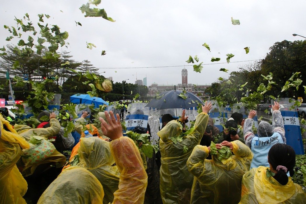 抗議群眾向向蔡辦投擲一堆“爛菜”,表達心中怒火。(圖片來源:臺灣《聯(lián)合報》)
