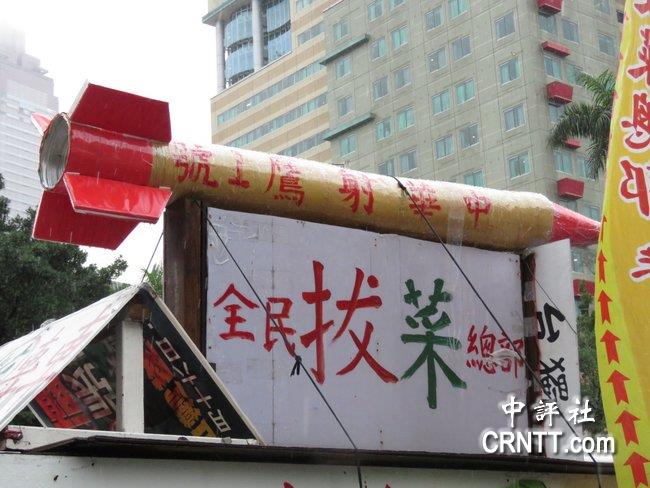 由臺灣“公務人員協會”號召的反年改抗議,15日再度在“立法院”周邊登場,雖然整個下午都大雨不停,但澆不熄退休軍公教人員的怒火。其中,一輛名為“全民拔菜總部”的宣傳車上,更架有“中華獵鷹一號”飛彈,非常吸睛,讓許多抗議民眾紛紛合照留念。