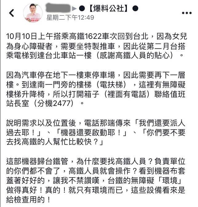 據(jù)臺(tái)灣“聯(lián)合新聞網(wǎng)”報(bào)道,一名網(wǎng)友在網(wǎng)上發(fā)文表示,自己的女兒是身心障礙者,移動(dòng)時(shí)需要特制推車的輔助。10號(hào)上午他與女兒搭乘臺(tái)灣高鐵抵達(dá)臺(tái)北車站,在高鐵服務(wù)員的幫助下到了臺(tái)北車站一樓,因?yàn)樾枰褂梦挥谂_(tái)鐵南一門旁的無障礙樓梯升降椅通往地下室,所以打電話聯(lián)絡(luò)值班站長室尋求幫助,沒想到對(duì)方卻以“還要派人過去啟動(dòng)機(jī)器很麻煩”推托,之后還向該名網(wǎng)友提議“要不要去找高鐵的人幫忙比較快?”