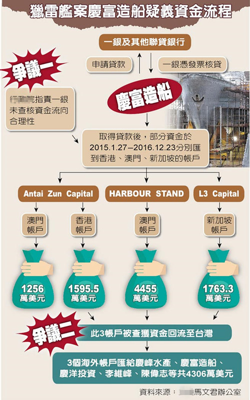 馬文君指出,慶富往Antai Zun Capital香港賬戶匯了1595.5萬美元、HARBOUR STAND澳門賬戶有4455萬美元、L3 Capital新加坡賬戶有1763.3萬美元,這三筆賬戶有資金回流到臺灣,匯往慶峰水產(chǎn)、慶富造船、慶洋投資,以及慶富相關(guān)人士利瓦伊峰以及陳偉志的戶頭,共4306萬美元,約13億新臺幣。