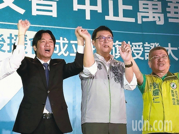 賴清德(左)5日晚間前往姚文智(中)造勢場合,助講拉抬選情。(圖片來源:臺灣《聯合報》)