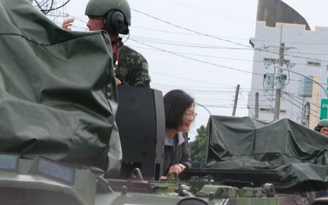 蔡英文8月25日搭乘云豹裝甲車勘災(zāi),向災(zāi)民微笑。(圖片來自臺媒)