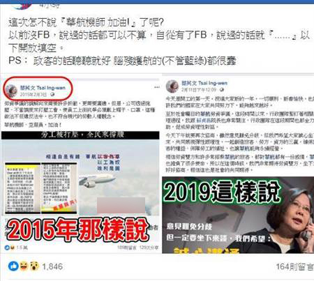 有網友在臉譜網不公開社團“爆政公社”分享兩張蔡英文臉譜網截圖,一張是2015年華航機師醞釀罷工時,蔡英文力挺,還喊“機師、空服員加油”,一張是2019年2月11日華航機師罷工進入第4天時,蔡英文遭質疑神隱后首度談話,希望勞資雙方誠心坐下來協(xié)商,創(chuàng)造三贏。該網友說,蔡英文這次怎么不說“華航機師加油”了呢?以前沒有臉譜網,說過的話都可以不算,自從有了臉譜網,說過的話就“……”以下開放填空,還說政客的話聽聽就好,腦殘護航的都很蠢。