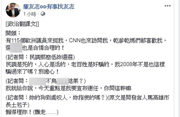 羅友志臉譜網發文。(圖片取自臺媒)