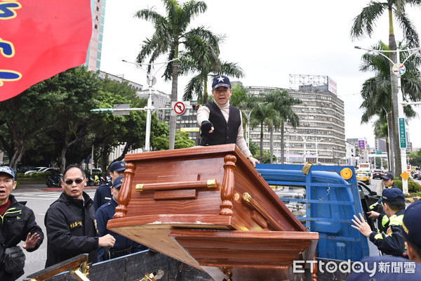 統一促進黨張安樂等人帶棺材前往“立法院”抗議。(圖片來源:臺灣“東森新聞云”)