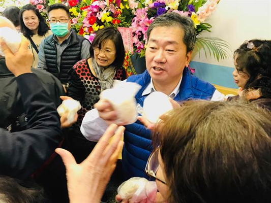 國民黨基隆市黨部主委黃希賢的“立委”初選服務處今(12)日正式成立,黃希賢在現場發放包子,響應高雄市長韓國瑜的熱潮。(圖片來源:臺灣“中時電子報”)
