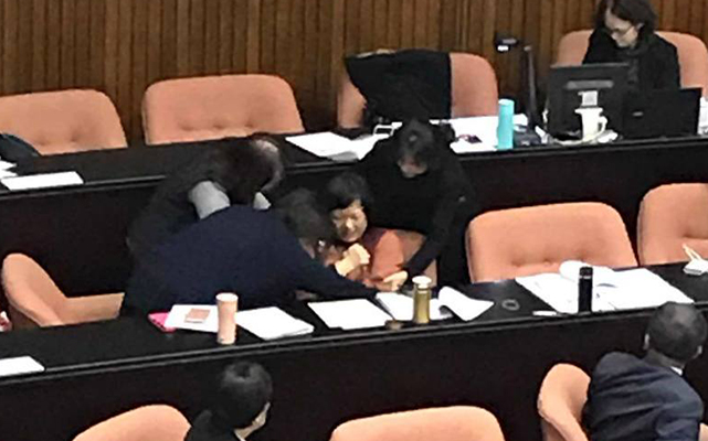 “行政院交通環境資源處處長”陳盈蓉在“立法院”議場疑因身體不適,在官員席上發出尖叫聲。(圖片來源:臺灣《聯合報》)