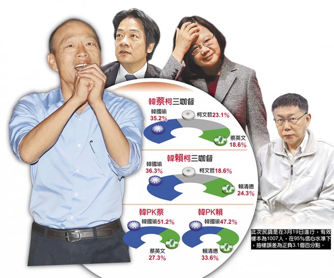 中國(guó)臺(tái)灣網(wǎng)3月21日訊 據(jù)臺(tái)灣《中國(guó)時(shí)報(bào)》報(bào)道,臺(tái)當(dāng)局前“行政院長(zhǎng)”賴清德宣布投入民進(jìn)黨內(nèi)臺(tái)灣地區(qū)領(lǐng)導(dǎo)人初選后,依據(jù)《旺旺中時(shí)媒體集團(tuán)》最新民調(diào)顯示,只要國(guó)民黨派出韓國(guó)瑜,無(wú)論是“韓vs.賴”雙雄對(duì)決,或是柯文哲也參戰(zhàn)的“三咖督”,韓均全面領(lǐng)先,且至少領(lǐng)先賴12個(gè)百分點(diǎn),是藍(lán)營(yíng)唯一面對(duì)任何賽局都能壓制對(duì)手的最強(qiáng)戰(zhàn)將。