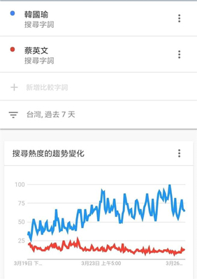 中國(guó)臺(tái)灣網(wǎng)3月28日訊 據(jù)臺(tái)灣“中時(shí)電子報(bào)”報(bào)道,前臺(tái)當(dāng)局“行政院院長(zhǎng)”賴清德日前宣布參加民進(jìn)黨內(nèi)2020提名初選,正式向蔡英文下挑戰(zhàn)書!臺(tái)灣民調(diào)顯示,賴無(wú)論看好度還是民進(jìn)黨認(rèn)同者支持度,均碾壓蔡。此外,有臺(tái)網(wǎng)友貼出搜尋熱度趨勢(shì)圖,表示,好憂傷,明明都是“出訪”為啥越打韓(韓國(guó)瑜)自己(蔡英文)聲量越低,人家卻不斷上漲呢?