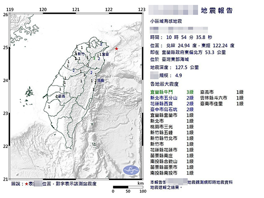 今天上午10時(shí)54分在臺(tái)灣東部海域發(fā)生里氏規(guī)模4.9級(jí)地震。(圖片取自臺(tái)媒)