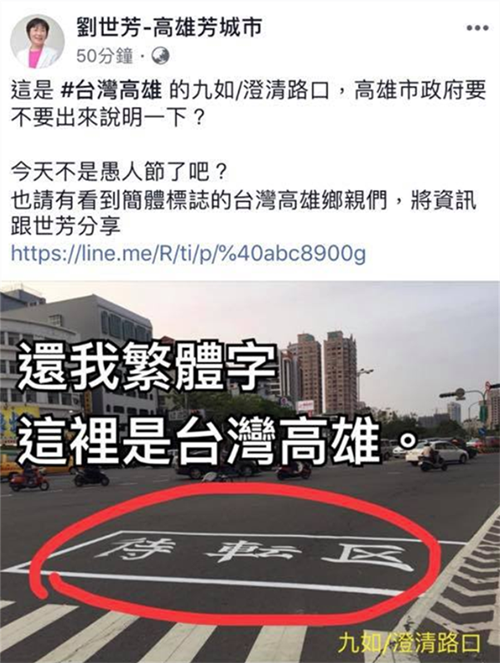 劉世芳指控九如澄清路口的“待轉(zhuǎn)區(qū)”三字竟然是簡(jiǎn)體字,并要求高雄市政府出來(lái)說(shuō)明,“今天不是愚人節(jié)了吧?也請(qǐng)有看到簡(jiǎn)體標(biāo)志的臺(tái)灣高雄鄉(xiāng)親們,將信息跟世芳分享”。經(jīng)網(wǎng)友指正后,劉世芳又悄悄將“簡(jiǎn)體”兩字修改成“非繁體字”。