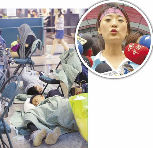 長(zhǎng)榮空服員罷工第3天遇上周末,桃園機(jī)場(chǎng)內(nèi)2名排隊(duì)等候的旅客累得席地而睡。(圖片來源:臺(tái)灣“中時(shí)電子報(bào)”)