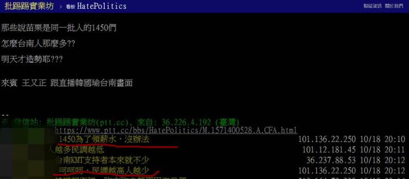 臺灣批踢踢論壇上的網友看到這個場面,也紛紛震撼表示,“那些說苗栗是同一批人的1450們,怎么臺南人那么多?明天才造勢耶”、“呵呵呵,民調越高人越少”、“真的很多,別小看鐵粉”、“1450會崩崩啦”。ㄖ袊_灣網 楊旋)