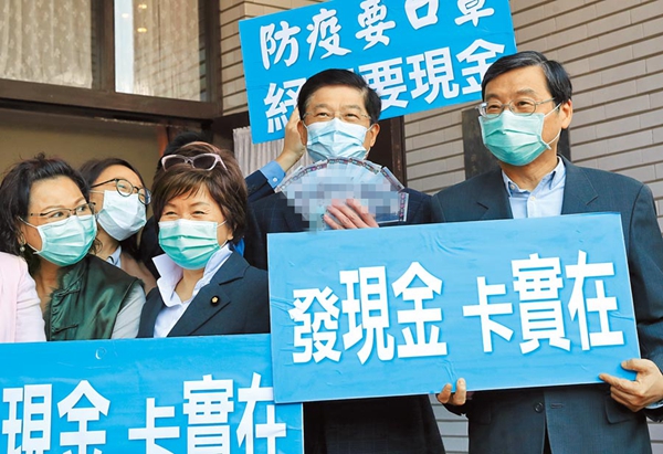 民調顯示,83%的民眾贊成發現金或消費券。圖為臺“立院”國民黨團4月10日發表“發現金給口罩”主張,要求民進黨當局發放紓困現金。(圖片來源:臺灣“中時電子報”)