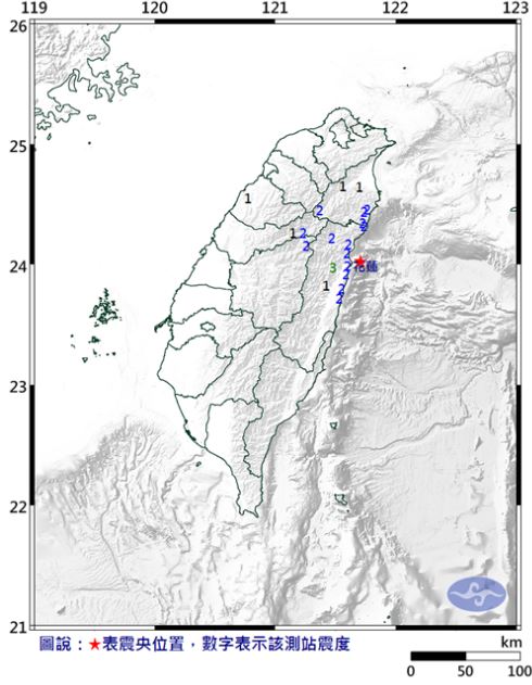 臺灣花蓮縣近海發生4.4級地震 最大震度3級