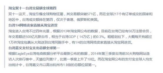 先拿最簡(jiǎn)單的網(wǎng)購(gòu)來(lái)說(shuō):當(dāng)某寶剛剛進(jìn)入到臺(tái)灣省時(shí),不論是人性化的購(gòu)物體驗(yàn)還是精細(xì)化分的購(gòu)物選擇,都比臺(tái)灣當(dāng)?shù)爻涑庵鴣y七八糟廣告的網(wǎng)購(gòu)平臺(tái)強(qiáng)很多,但有些臺(tái)灣同胞們嘴上說(shuō)著不要,可身體卻很誠(chéng)實(shí)的在某寶上瘋狂網(wǎng)購(gòu)。