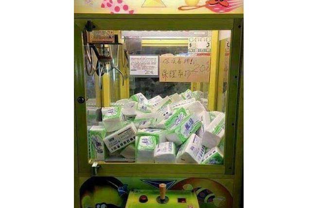 更夸張的是,連臺(tái)灣的夾娃娃機(jī)里面竟也夾起了“衛(wèi)生紙”,業(yè)主甚至還標(biāo)榜“沒(méi)看錯(cuò),保證取物20元”!惹得網(wǎng)友不禁感嘆:大陸都是搶房、搶金子,而我們?cè)趽屝l(wèi)生紙和奶茶,臺(tái)灣就是個(gè)笑話……