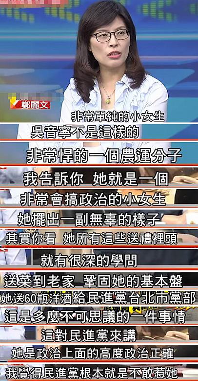 “行政院”前發言人鄭麗文則直言,吳音寧分明就“非常會搞政治”,并且因為她在民進黨高層眼中是“政治上高度正確”,所以民進黨團里根本沒人敢惹她!