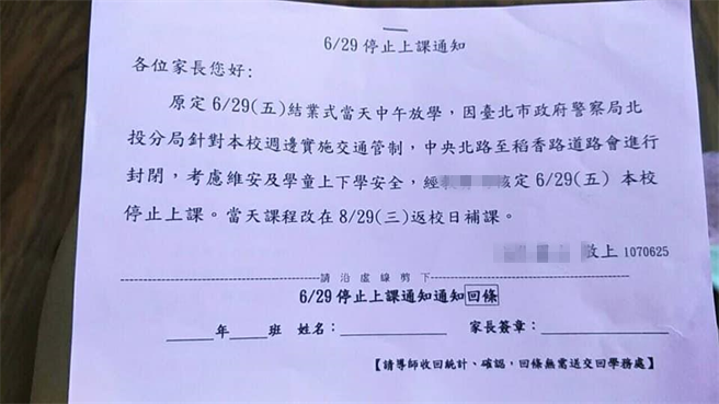 29日,臺灣地區領導人蔡英文出席“三軍六校聯合畢業典禮”,鄰近的文化小學一度被迫停課,一名家長在臉譜網曝出《停課通知單》,并發文抱怨道:“真的假的公文?‘三軍六校畢業典禮’是什么大事,到底哪位天王要去,搞到如此這般大規模管制,連小學生都停課,要不要頒布戒嚴令?”