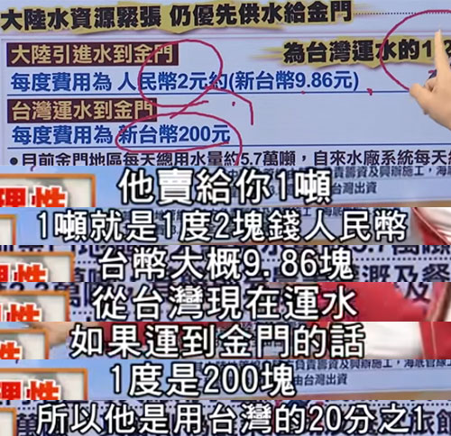 提到民生,水價自然是老百姓最關(guān)心的問題。據(jù)悉,從福建到金門,大陸方面向臺灣民眾收取的費用為9.86元(新臺幣,下同)一噸,而從臺灣運輸?shù)浇痖T,費用為200元一噸,換句話說,大陸收取的水費只占臺灣的二十分之一,孰優(yōu)孰劣,高下立判。