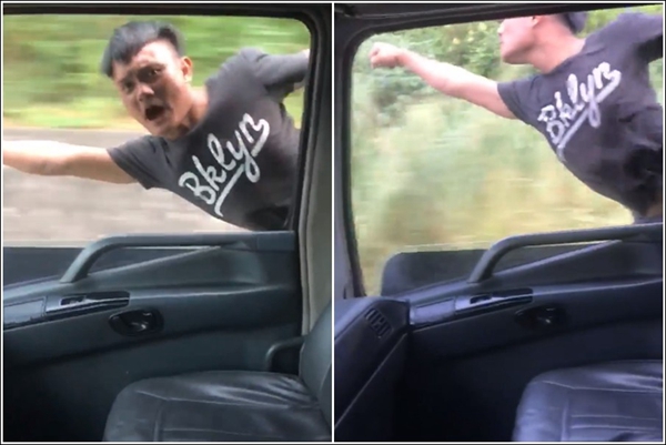 透過影片可見,這名男子在卡車行進時,先用左手抓住貨車固定好自己,身體向外懸出車窗,右手往前伸直,貌似超人的模樣正在飛行,隨后他對著車內的駕駛員詢問:“要買東西嗎?有沒有東西要買?沒有嗎?那我走啰!”接著向外呈現出“飛走”的模樣消失在鏡頭前。