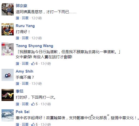 打完鄭麗君后,鄭惠中便“瀟灑”地走了,還若無其事的吃完了餐會,之后在受訪時也毫無歉意地說“我只賞她一巴掌,已經太便宜她”、“這種人,我這樣子打她,只是剛好而已”,更“細致”的還原了經過“可能她臉上還有留下我指痕”。