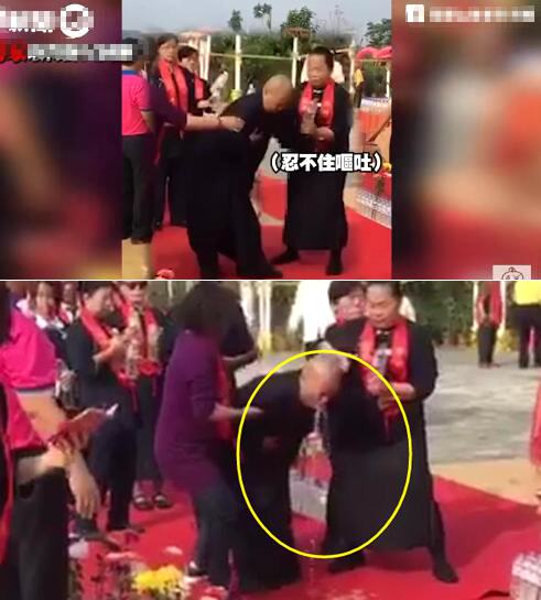 只見法師先是嘗試露出微笑,但撐了不到2秒便伸手要身旁的信徒攙扶,大概是胃里的食物已經(jīng)呼之欲出了,接著她就對紅毯大吐特吐了起來,信徒們看了也不知如何是好啊,只能拍拍法師的背,等她吐完。