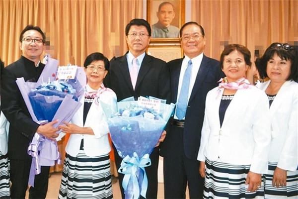 國民黨臺南市黨部舉行新舊任主委交接典禮,黨員獻花祝福新主委謝龍介(右四)。(圖片來源:臺灣《聯合報》)