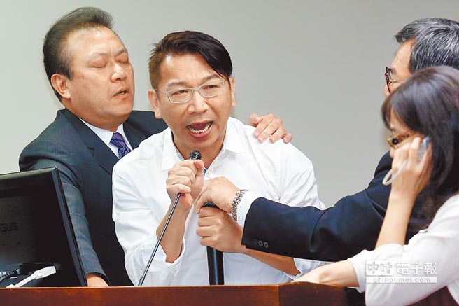 徐永明霸占發言臺,讓“一例一休”審查數度中斷。(圖片來源:臺灣“東森新聞云”)