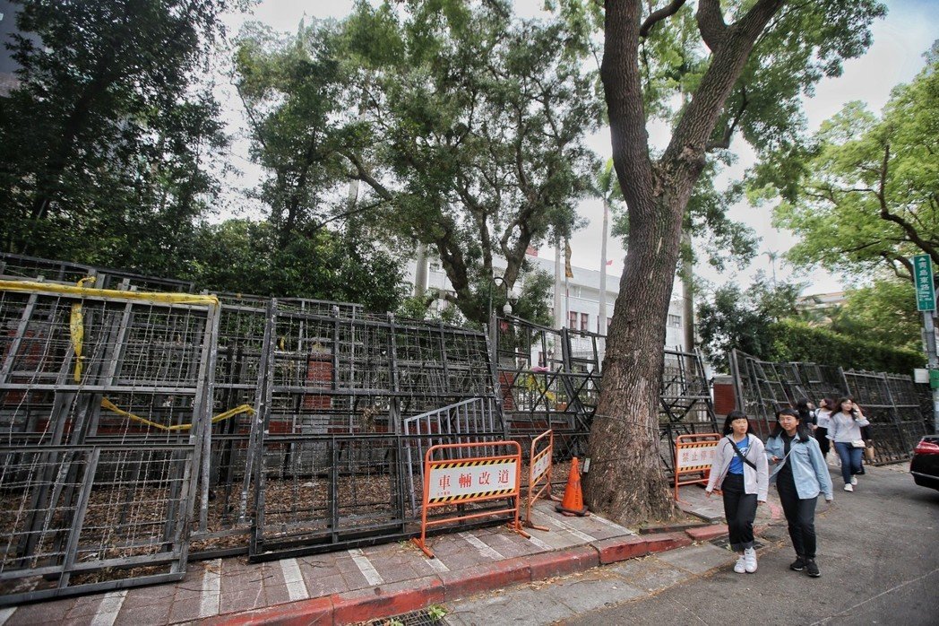 臺灣“立法院”青島東路架設(shè)了層層拒馬占據(jù)人行道。(圖片來源:臺灣《聯(lián)合報》)