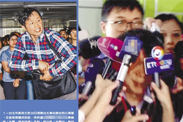 臺北市長柯文哲28日視察臺北車站聯合防災演習,在接受媒體采訪前,突然遭“臺灣國”辦公室主任陳峻涵(左圖)丟鞋,柯文哲(右圖)立刻蹲下身體。(圖片來源:臺灣《中時電子報》)